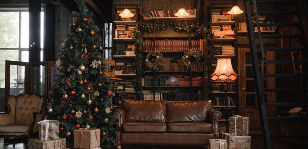 The Ralph Lauren Christmas hinges on “aspirational escapism,” according to interior designers analyzing the trend. It borrows heavily from designer Ralph Lauren’s Bedford estate and promises phone-free festivities, crackling fireplaces, and perfectly creased trousers. The palette features deep moody tones like hunter green, oxblood, navy, and espresso brown, accented with cream and polished silver. Textures like velvet, cashmere, and leather are essential, along with fresh pine garland (thick, never droopy), tartan plaid somewhere visible, and vintage-style ornaments that look inherited even when they’re not.